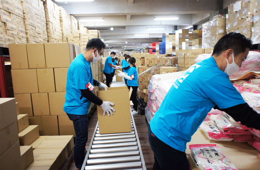 当社からは社員10名が参加し、千葉県船橋市の倉庫にて梱包作業を行いました。2022年7月に続き、今回が2回目の参加となります。